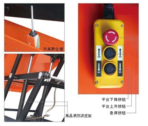 • 內部電源組配置有安全閥及補償流量開關,安全閥可以防止超負荷運作,補償流量開關可以控制低速,液壓系統帶防爆閥壓當油管爆裂時,可防止平臺急速下降;
