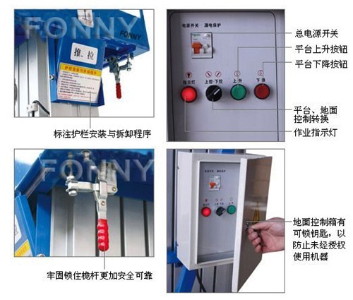 • 平臺(tái)控制:平臺(tái)上標(biāo)有操作動(dòng)作標(biāo)示圖,易于理解操作。地面也可控制設(shè)備的升降 ;